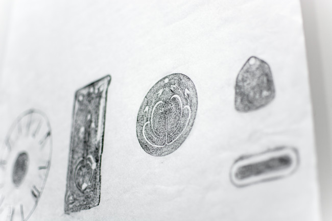Empêchement, 2023. Empreintes par frottage sur papier Wenzhou, 6 panneaux de 250 x 49 cm