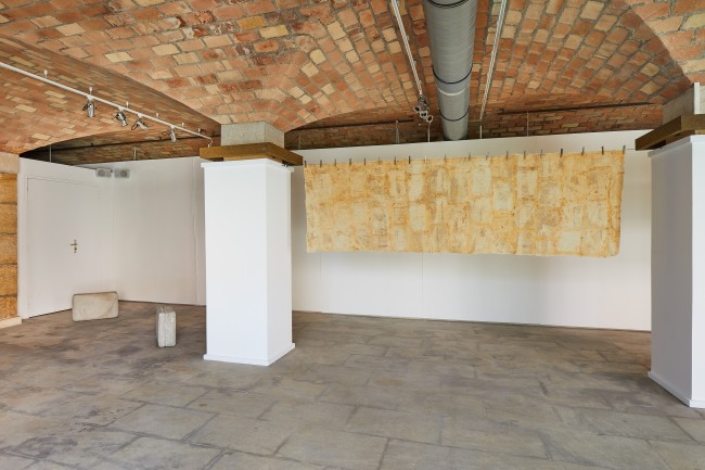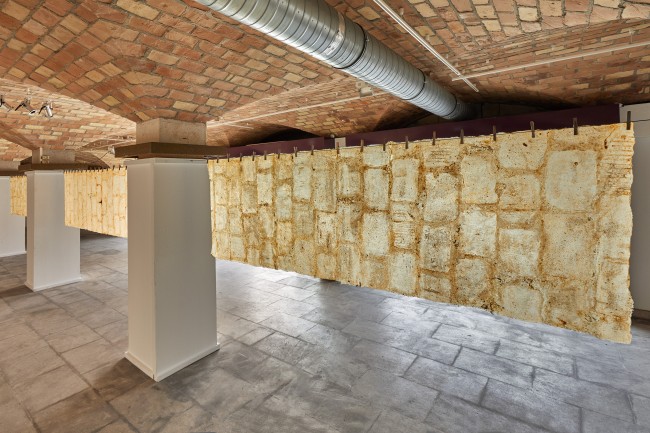 Jusque dans les années 1960, les lavandières lavaient le linge au lavoir de Tholon à Martigues. Avec du latex, j’ai prélevé des empreintes des pierres de ce lavoir, pierres usées par les genoux des lavandières. Les trois empreintes sont accrochées ici comme le seraient les draps qu’elles mettaient à sécher. C’est une forme d’hommage à ces femmes lavandières, ces femmes du peuple, dont le travail et la place dans la société sont invisibilisés.